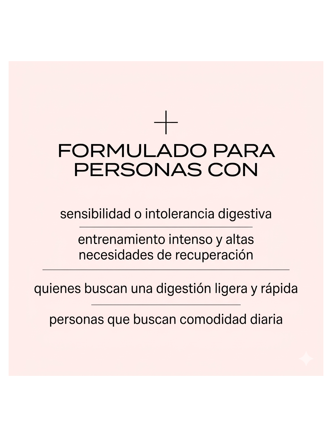 Recomendación para deportistas y personas con digestión sensible: Perfecta para quienes entrenan intensamente y necesitan una recuperación rápida, así como para personas con dificultades digestivas, ya que su fórmula es más ligera y suave para el sistema gastrointestinal.