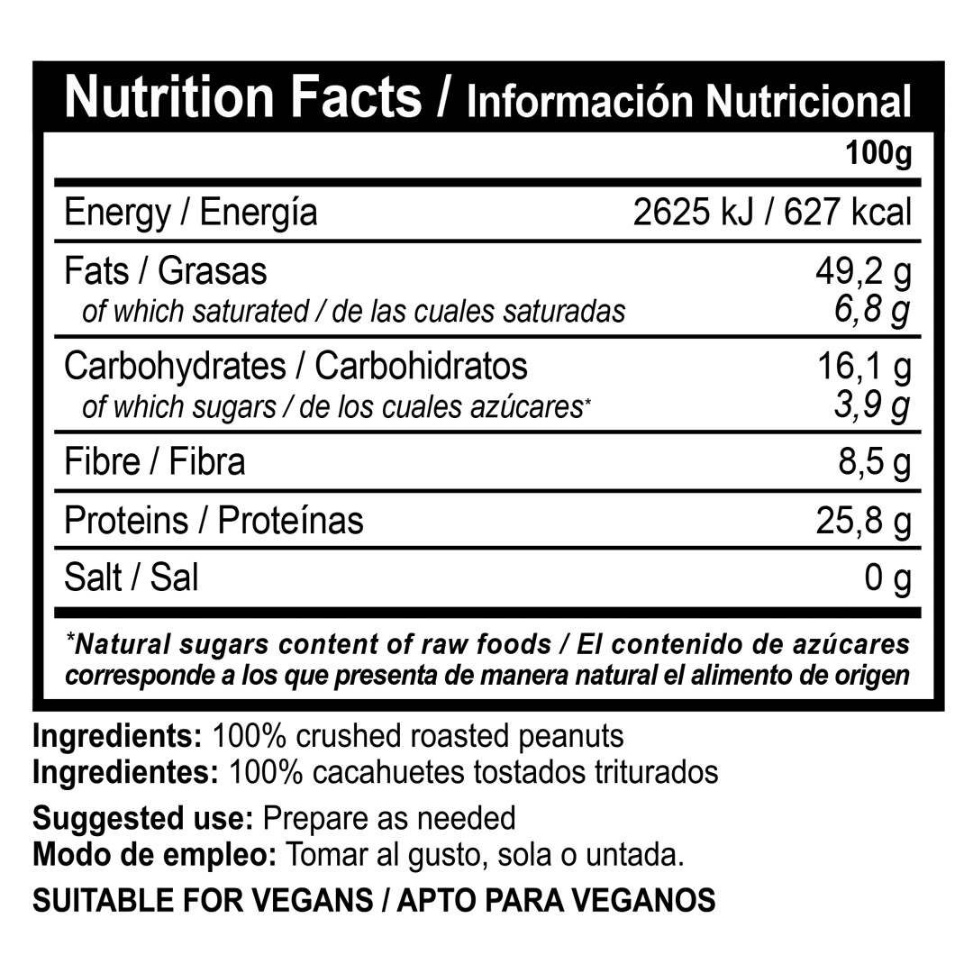 Esta crema de cacahuete es una fuente muy importante de proteínas vegetales, que como sabemos contribuyen al aumento y mantenimiento de la masa muscular, cuyos ingredientes, a diferencia de otras cremas existentes en el mercado, son únicamente 100% cacahuetes tostados, sin aceite de palma, sin sal ni azúcares añadidos, sin ningún tipo de aditivo, conservante o grasas “trans”; solamente cacahuetes de primerísima calidad que proporcionan gran cantidad de vitaminas y minerales esenciales. Destacar su contenido en Magnesio, que contribuye a la reducción del cansancio, Fósforo, que contribuye a tener unos huesos y dientes fuertes, Vitamina E, que como sabemos es llamada “fuente de juventud”, ya que nos protege frente a los radicales libres, y un importante aporte de fibra, siendo por todo esto ideal para cualquier tipo de dieta, sea de pérdida de peso, mantenimiento o ganancia de masa muscular.